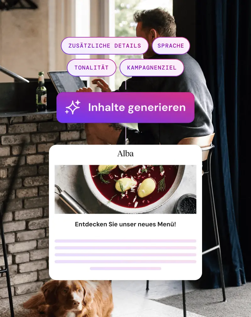 Überzeugende Marketingkampagnen zu erstellen kostet Zeit und Inspiration. Mit KI-Inhaltsvorschlägen erhältst du Empfehlungen für versandfertige Texte, die auf deine Zielgruppe und die Stimme deines Restaurants zugeschnitten sind.
