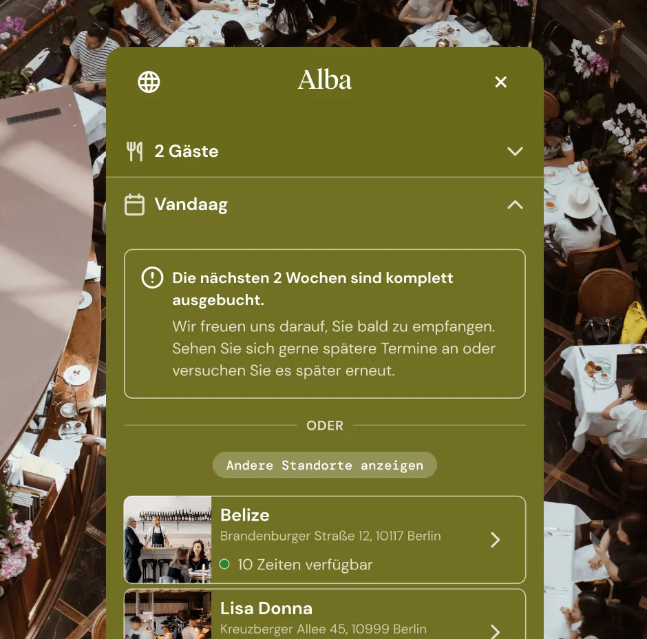 Unsere Online-Restaurantreservierungslösung wurde für eine Vielzahl von Restaurants entwickelt, die alle darauf aus sind, die Effizienz ihrer Reservierungen zu verbessern und den Umsatz zu steigern. Egal, ob Sie ein beliebter Ort vor Ort, eine Restaurantkette, ein großes Restaurant oder ein Restaurant mit gehobener Küche sind und bestrebt sind, von dem Moment an, in dem Kunden einen Besuch in Betracht ziehen, ein unverwechselbares Erlebnis zu bieten, unsere Plattform ist auf Sie zugeschnitten. Dieser Vorteil wirkt sich nicht nur positiv auf den Ruf Ihres Restaurants aus, sondern geht weit über die bloße Online-Reservierung eines Tisches hinaus. Unsere Lösung ermöglicht es Ihnen, sich auf das zu konzentrieren, was wirklich zählt: den Erfolg Ihres Unternehmens.