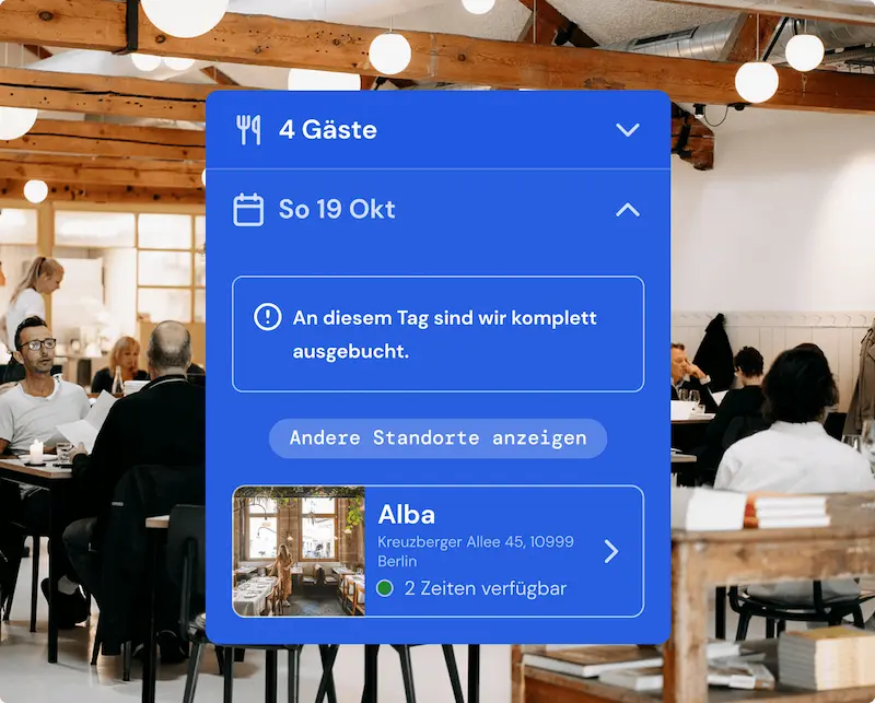 Ist ein Standort ausgebucht, werden Ihre Gäste automatisch an ein anderes Ihrer Restaurants weitergeleitet.