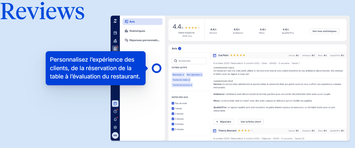 Pour ce faire, utilisez des logiciels CRM (Customer Relationship Management - gestion de la relation client) et actualisez régulièrement vos fichiers client. Réalisez des sondages, des questionnaires de satisfaction, demandez des feedbacks à vos convives…