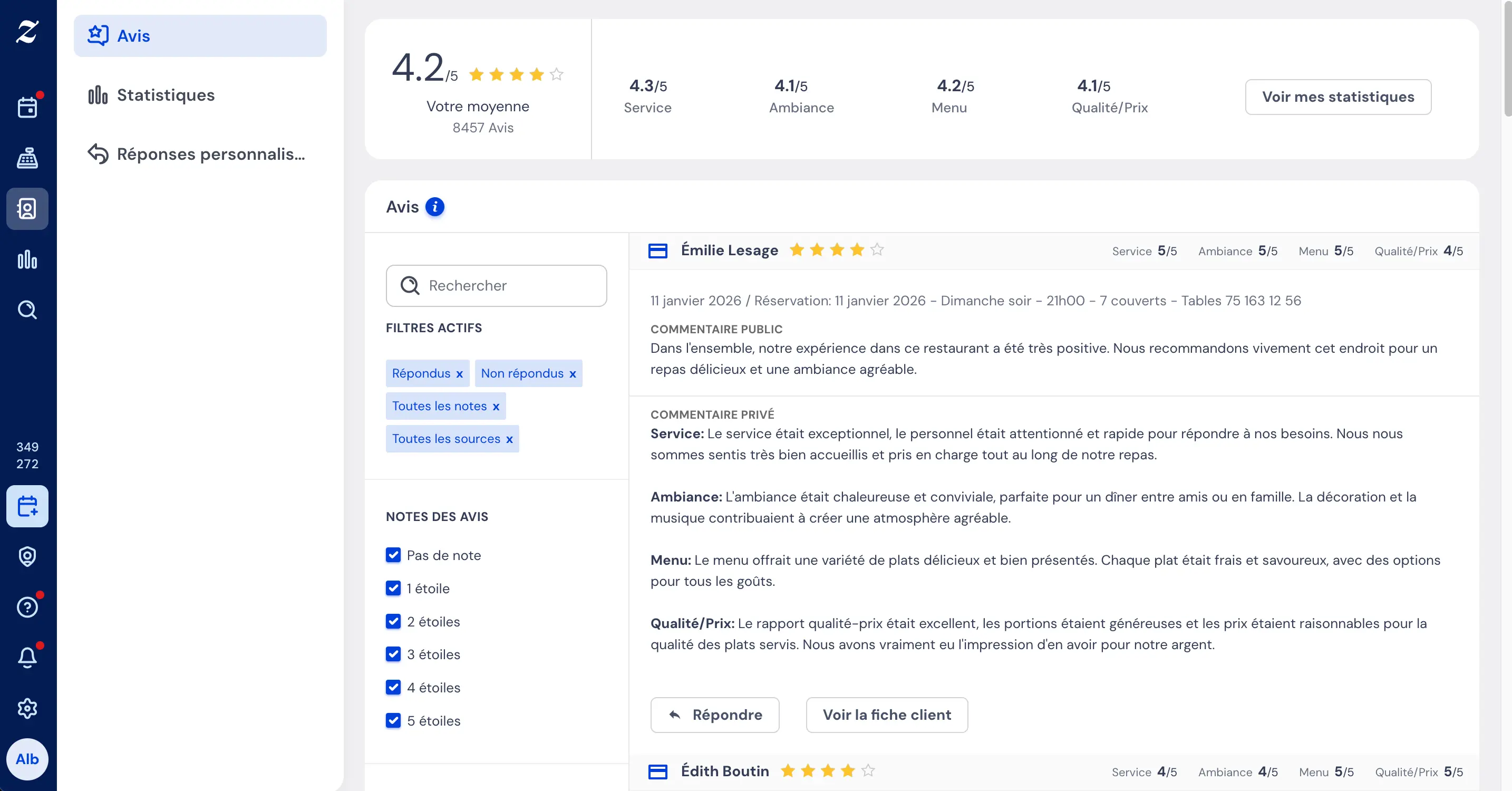 En savoir plusZenchefOS vous aide à collecter automatiquement des avis vérifiés après chaque réservation. Vous centralisez tous vos retours dans un seul espace, pouvez répondre aux clients, choisir les avis à publier et même les afficher sur votre site pour renforcer la confiance de vos futurs convives.